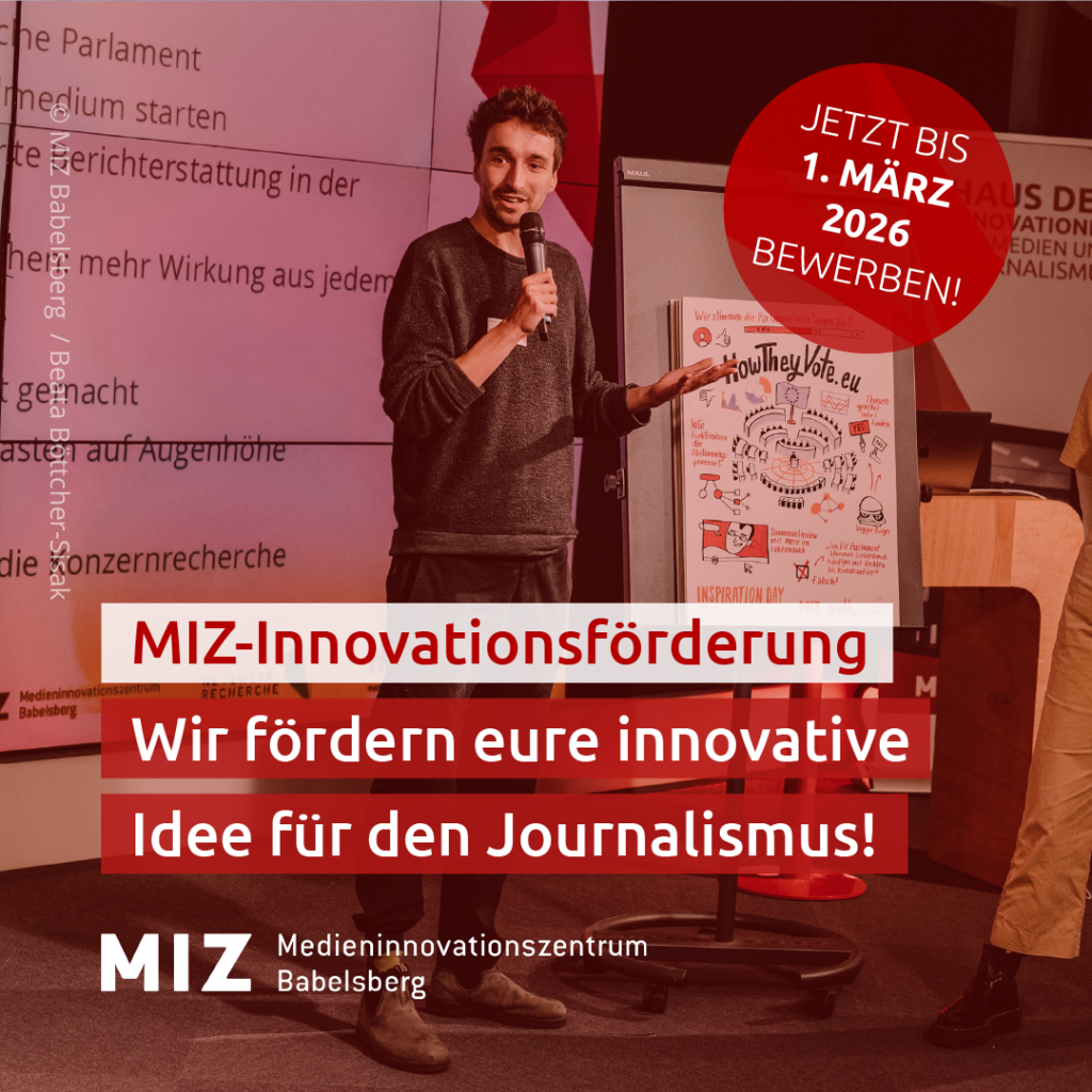 What is it about? The Media Innovation Center Babelsberg (MIZ) is looking for technically innovative ideas that future-proof journalism and the media industry. Whether tackling disinformation or strengthening news literacy – if you have a solution for current industry challenges, MIZ will support your implementation. The funding package includes financial support of up to €40,000, individual coaching (worth €1,500), access to professional production equipment (audio/TV), and co-working spaces at MIZ.
