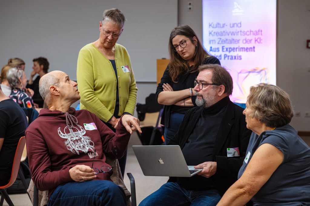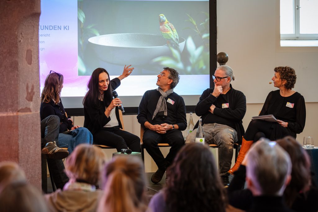 Den Auftakt bildete die Diskussionsrunde „Next Level Creativity – Wie KI die Kultur- und Kreativbranche verändert“, moderiert von Katja Dietrich-Kröck (MWAEK). Auf dem Podium diskutierten Jasdan Joerges (GuidePilot/MicroMovie), Anke Salomon (Design), Michael Boden (Subway to Sally), Katrin Reiling (TEXT FÜR ALLE) und Jan Gabbert (buchstabenschubser).
